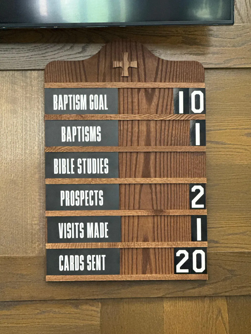 Made of high quality oak veneer plywood and guaranteed not to crack or warp. Carefully finished to bring out the natural beauty of the wood. Will harmonize with any of your present church or Sunday school furnishings. Raised oak crosses and solid oak slotted divider strips highlight the board. Ideal for posting attendance and offering records of your church and Sunday school. Complete with 13 slides and 60 numbers. Size of board: 20" x 30", 13 lbs. Uses slide set TS10013 cut to 3-5/8".