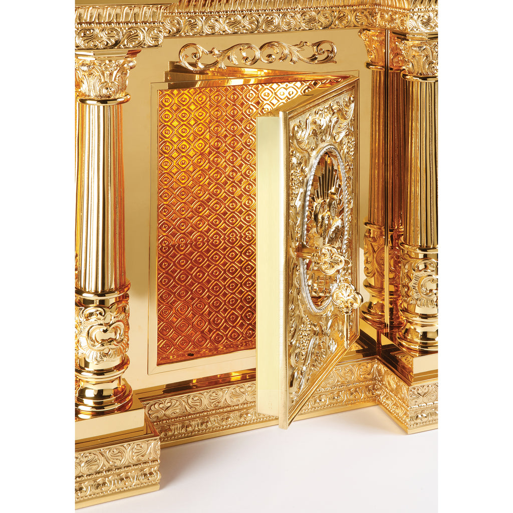 Superb over-sized baroque tabernacle, "The Four Evangelists", ideal for a Cathedral. The door ornamentation features the "Agnus Dei". The top finial decoration depicts the image of St. Michael. 50" high x 29-3/4" wide x 23-1/4" deep. 150 pounds. Single door opening: 16" high x 11" wide. Inner chamber size: 21-3/8" x 17" deep x 19-3/4" wide.
